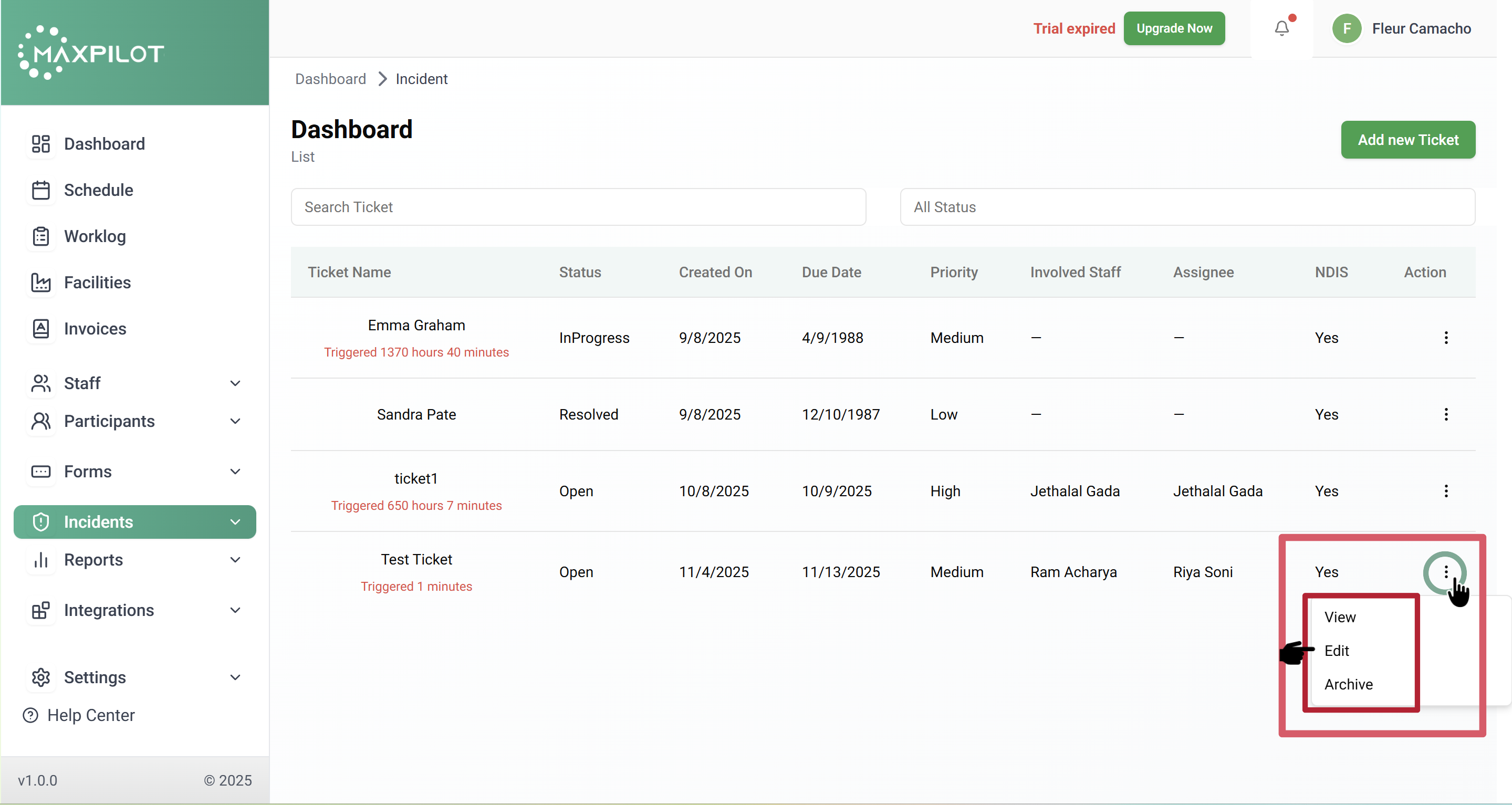 Find the ticket you want to modify and click on the three-dot (โ‹ฎ) menu under the Action column.