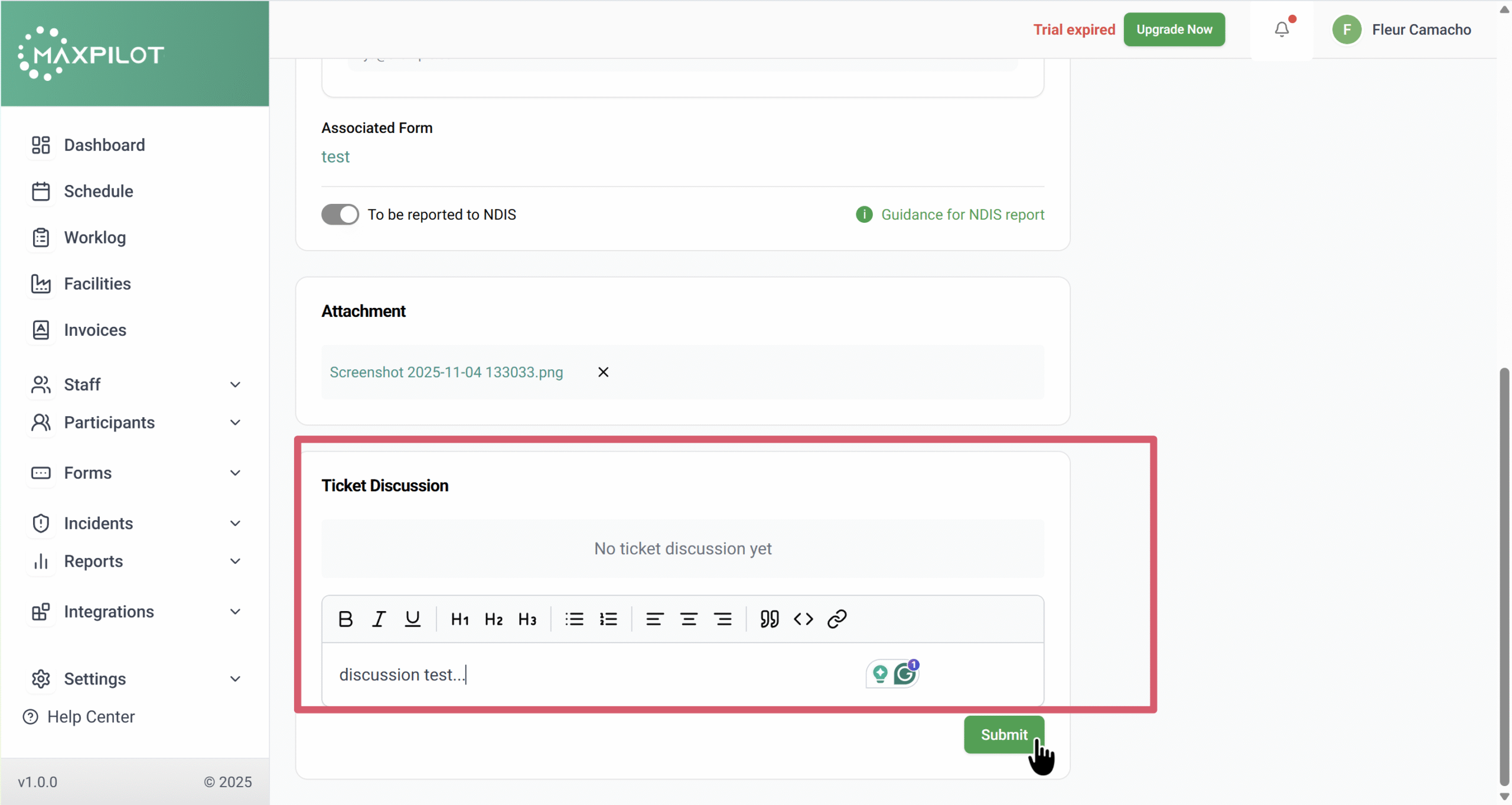 Scroll down to the Ticket Discussion section to add comments, progress notes, or updates.