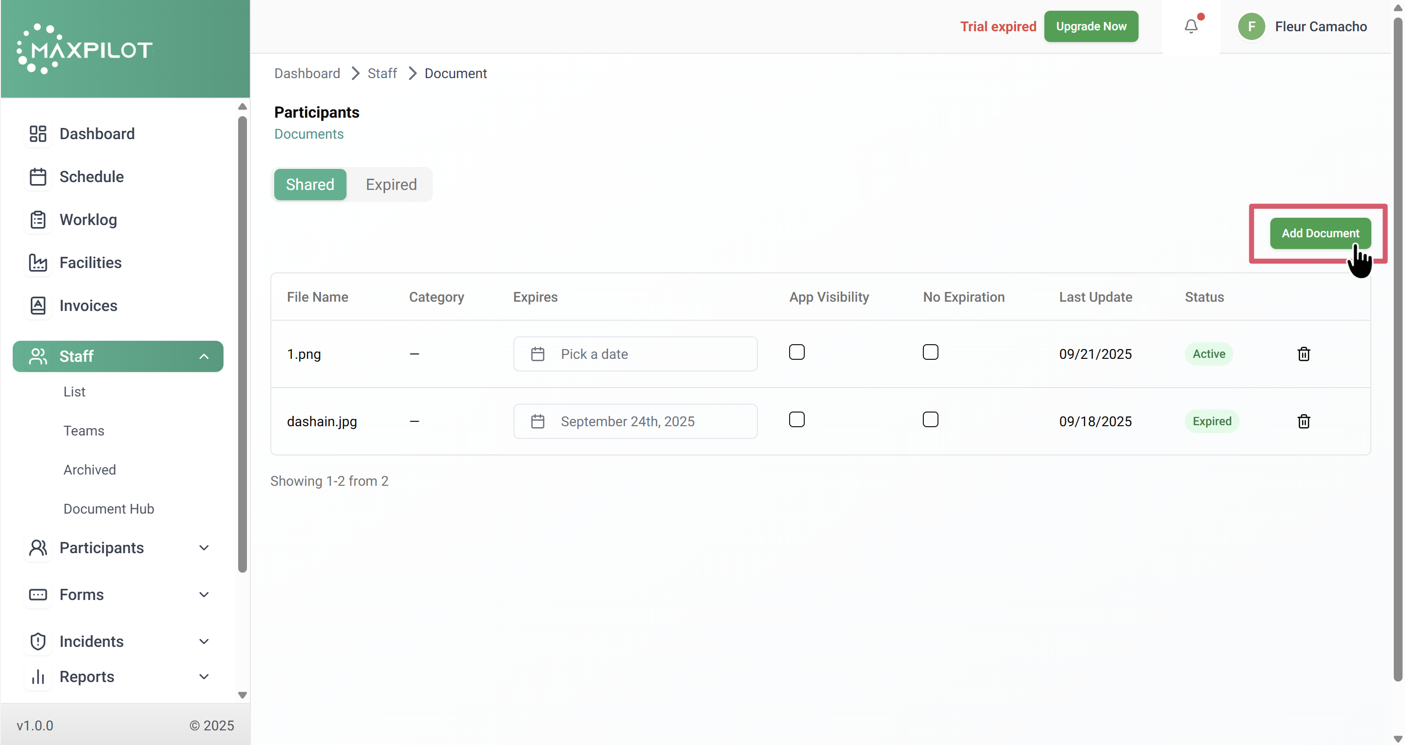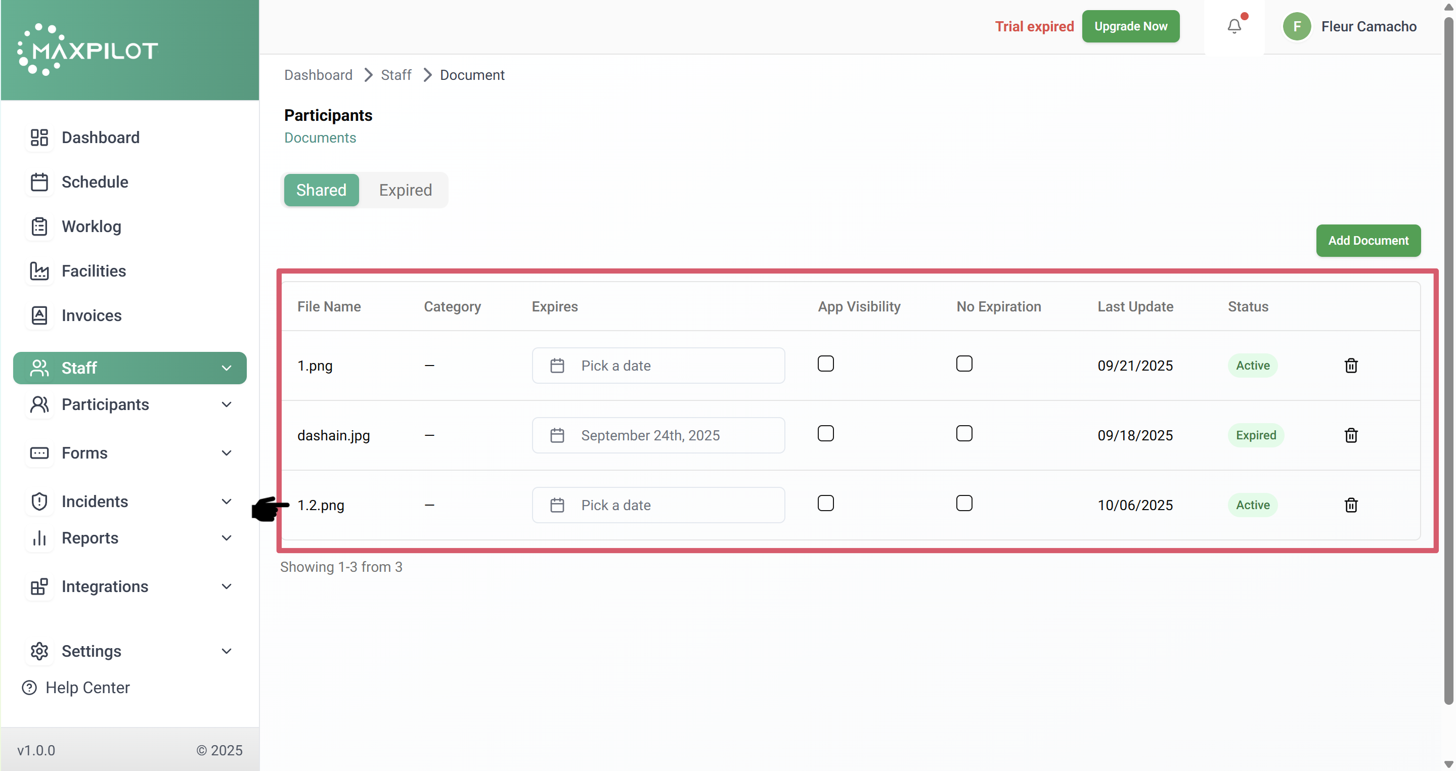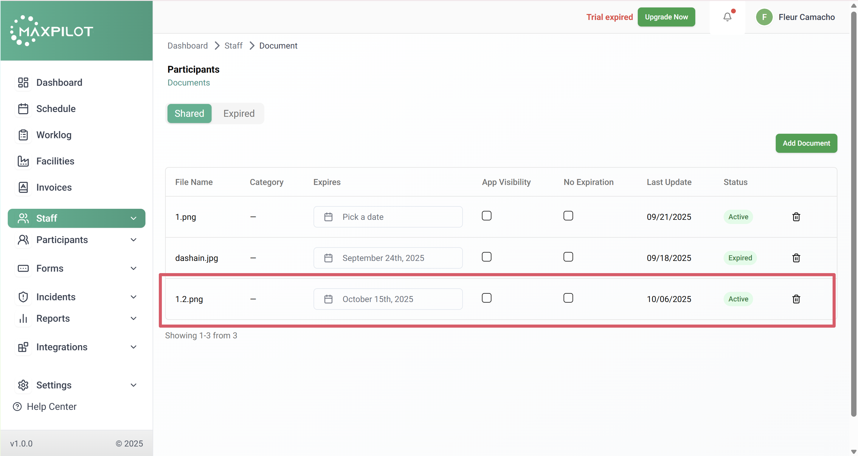 If a document has expired, it will automatically appear in the Expired tab, allowing administrators to easily review which staff members need to submit updated records. You can also delete documents by clicking the trash icon beside them.