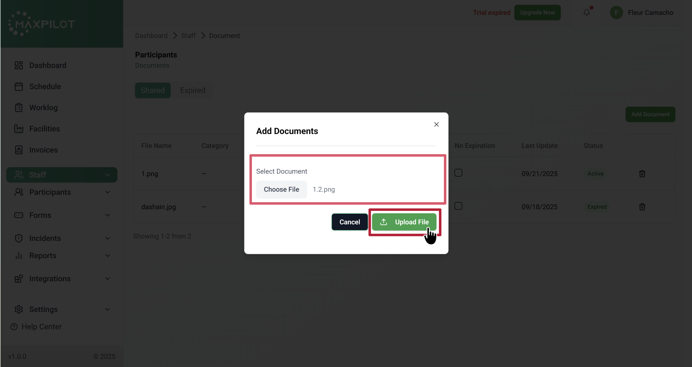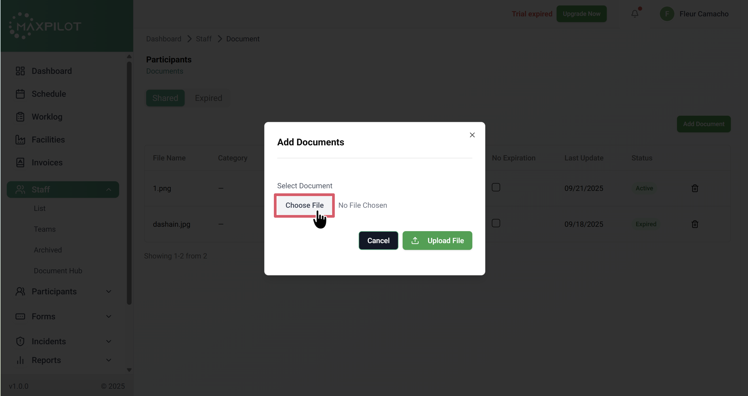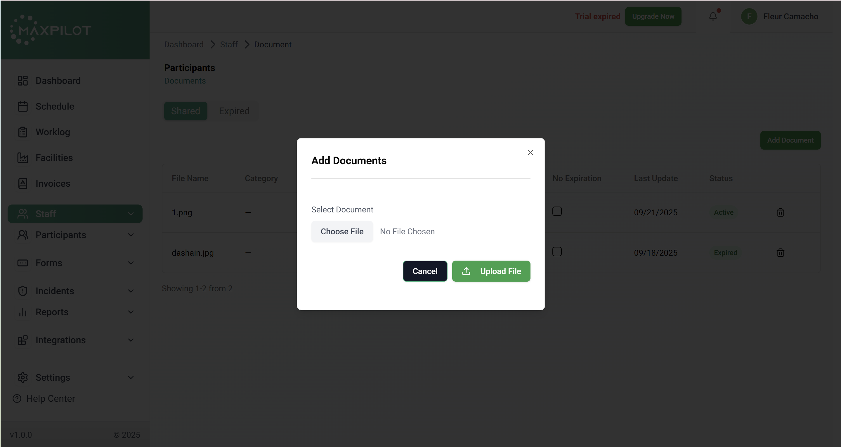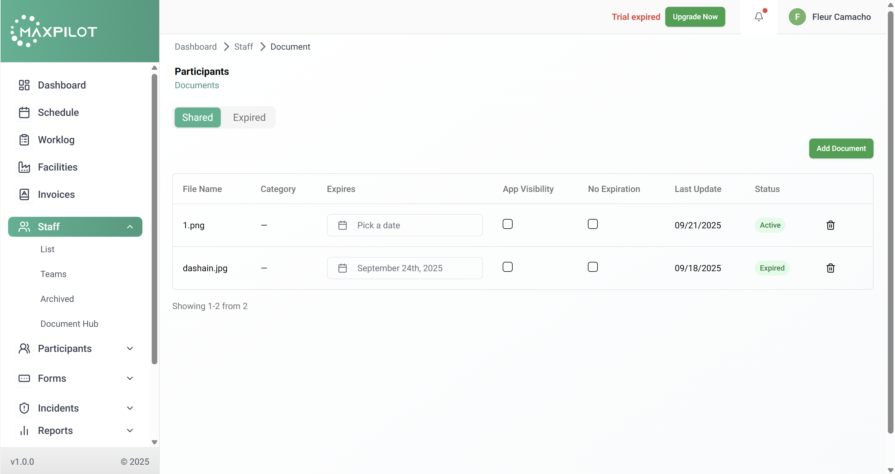 If a document has expired, it will automatically appear in the Expired tab, allowing administrators to easily review which staff members need to submit updated records. You can also delete documents by clicking the trash icon beside them.