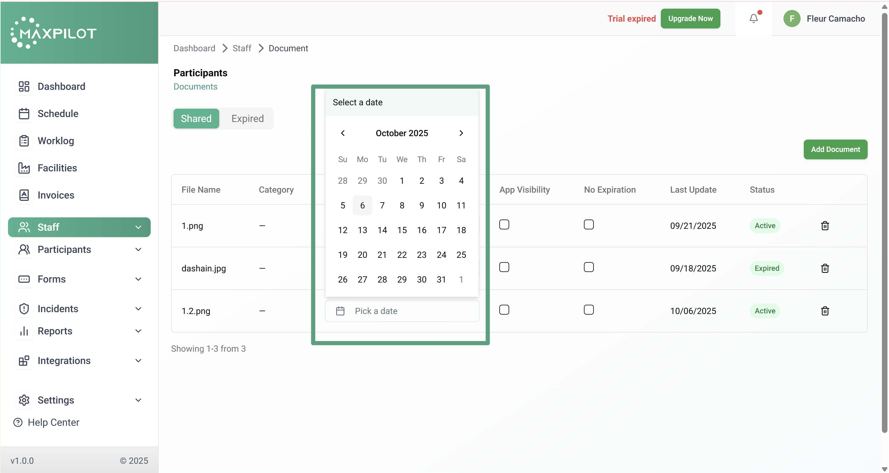 After uploading, administrators can set an expiration date for documents that require periodic updates, such as medical certificates or licenses.